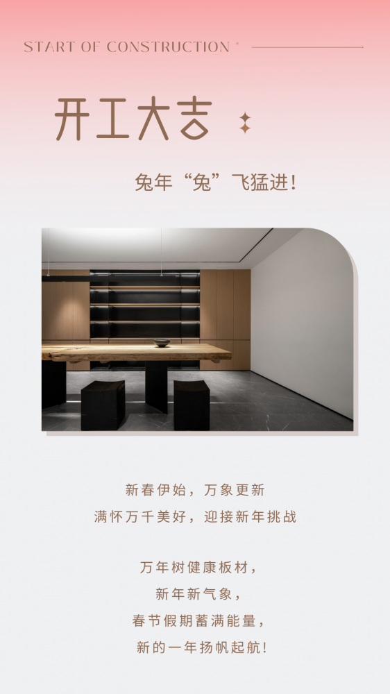 兔年開工第一天,一定會有驚喜在等待著我們,不退縮,不膽怯,懷揣希望與夢想,以嶄新的面貌迎來事業(yè),萬年樹健康板材恭祝大家開工大吉,平安健康!
